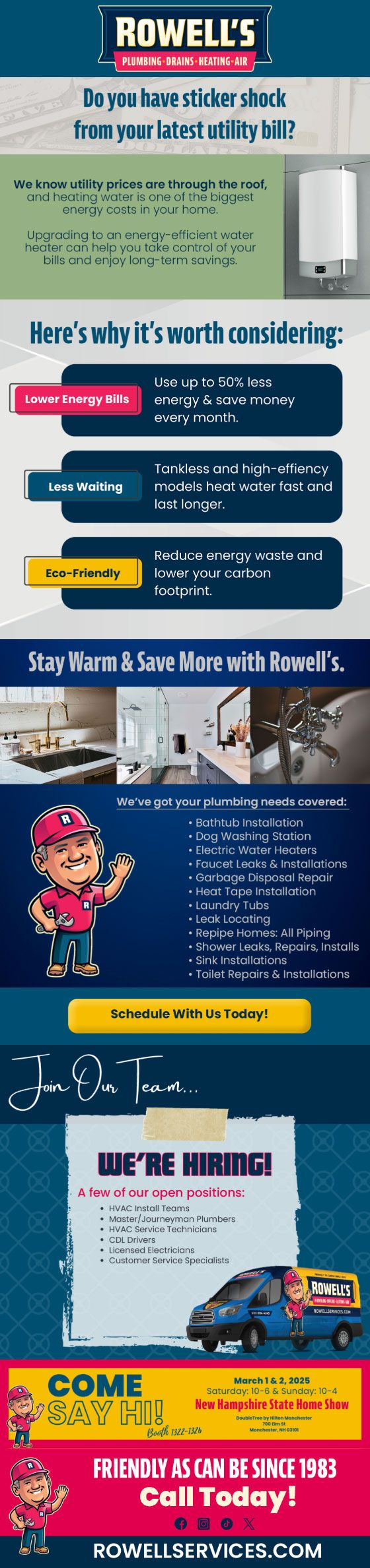 "Friendly As Can Be Since 1983!" When you need help with your plumbing, drains, heating, cooling or electrical in Hill, you can always rely on Rowell's Services! Call us now or book online!